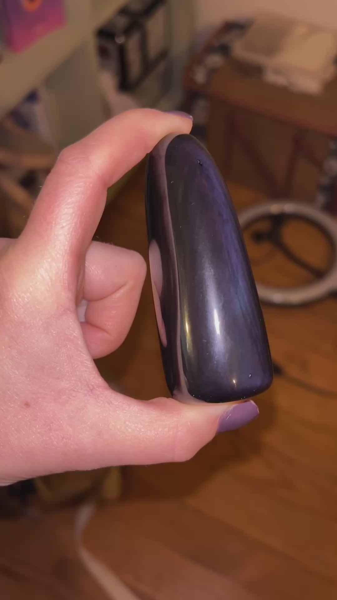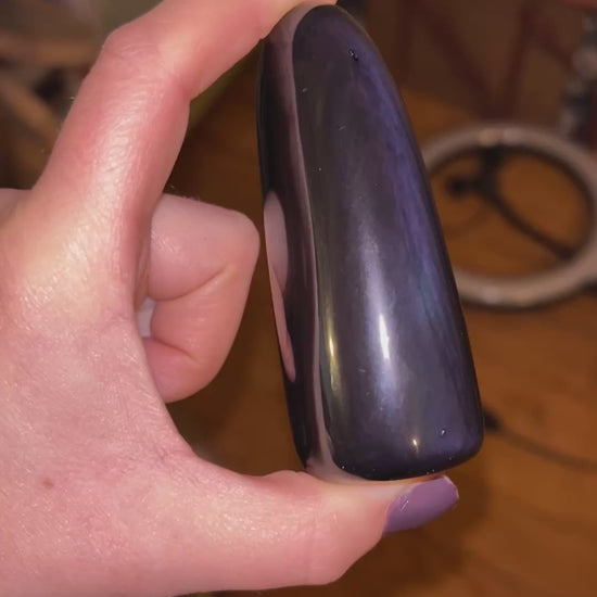Cette forme libre en obsidienne œil céleste présente une surface noire profonde et brillante, révélant de subtils reflets colorés visibles sous lumière directe ou avec un éclairage ciblé. Selon l’angle et la source lumineuse, des nuances violettes apparaissent d’un côté, tandis que des reflets verts se révèlent de l’autre.