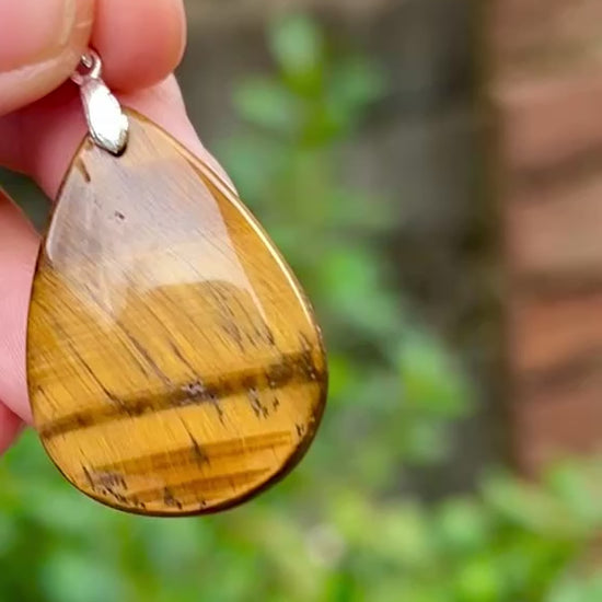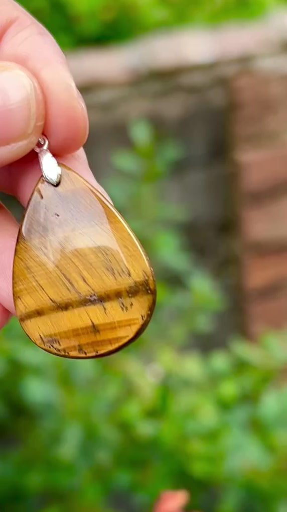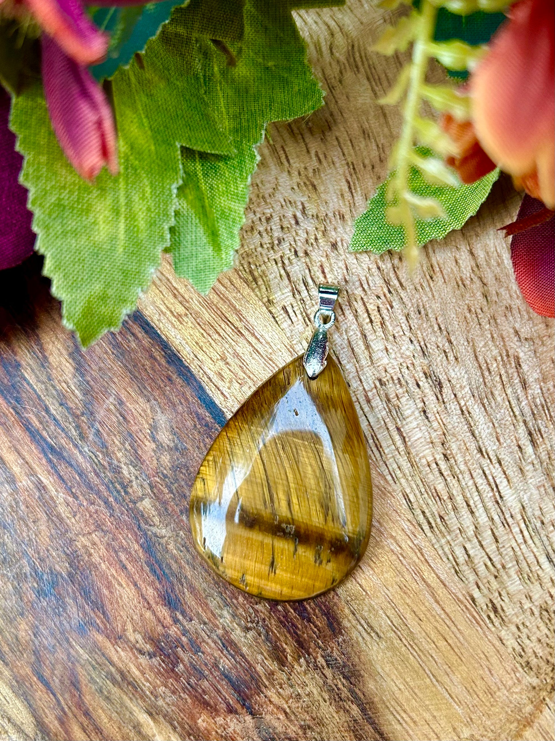 Ce pendentif en Œil de Tigre sculpté en forme de goutte est une pièce élégante et protectrice.