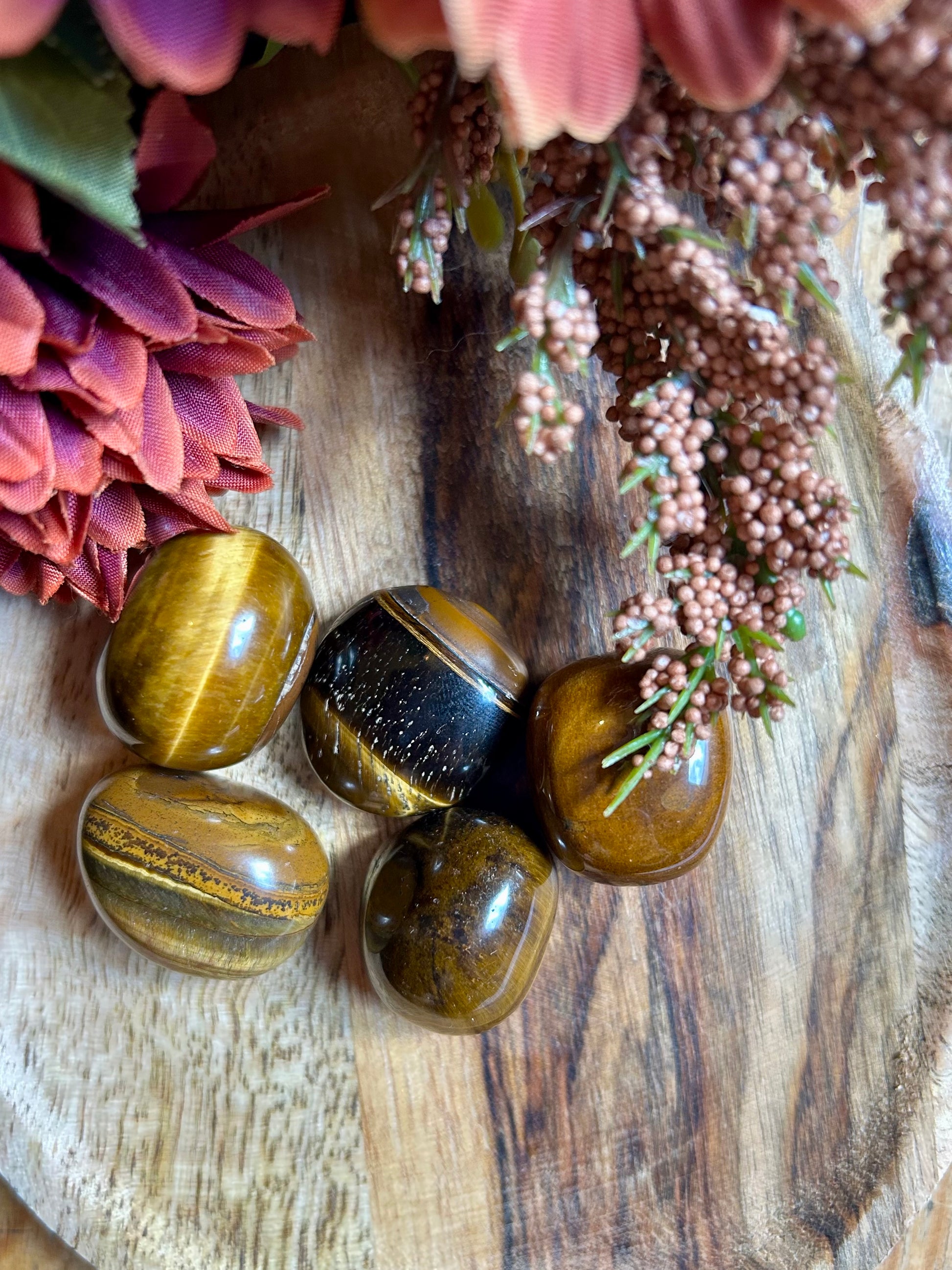 • Taille : Entre 20 et 30 mm, chaque pierre est unique, avec des nuances dorées, brunes et chatoyantes.